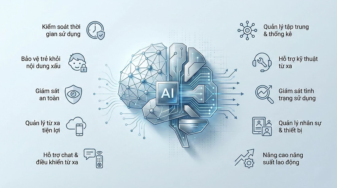 Phần mềm quản lý thiết bị là công cụ giúp tổ chức giám sát, điều khiển và quản lý tập trung máy tính, PC. Phần mềm cho phép thực hiện các thao tác như khóa/mở chức năng, giám sát trạng thái hoạt động, điều khiển từ xa, và đảm bảo tuân thủ chính sách quản trị thiết bị trong hệ thống.